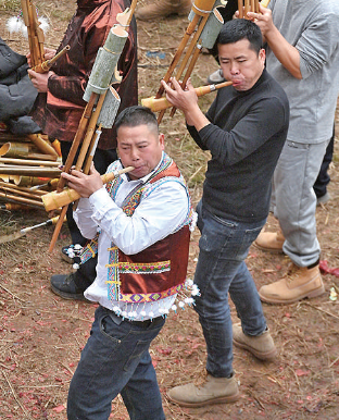 柳州市融水县十六古龙坡会上,村民在吹芦笙。新华社发