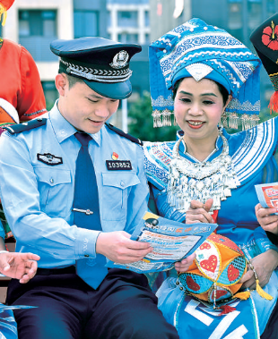 南宁市邕宁区壮族群众赶歌圩、对山歌,民警在现场讲解安防知识。资料图片